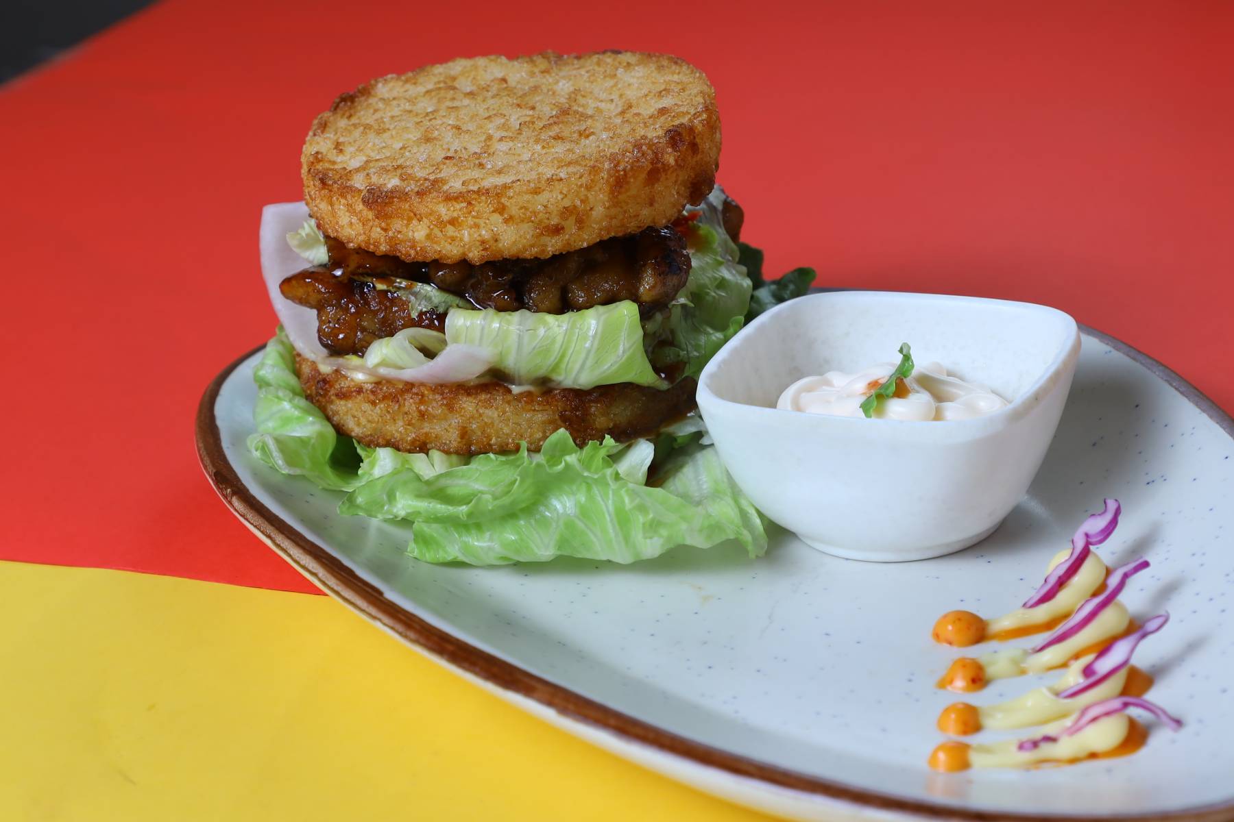 Grilled tofu or paneer coated with teriyaki glaze, sauteed mushroom and baby spinach. Served between crispy, pan fried rice buns. Included add ons: spicy mayonnaise